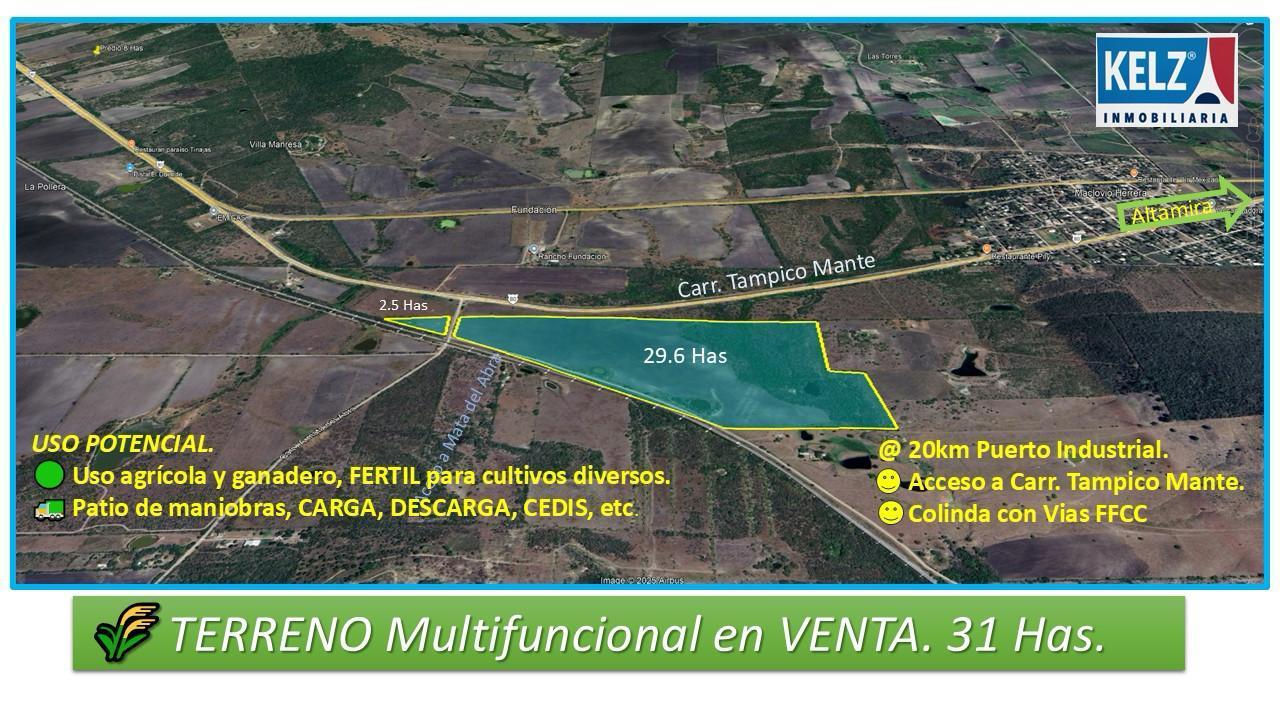 Terreno en venta de 31 HAS. (Dos porciones de 29 HAS Y 1 DE 2.5 HAS) Terreno listo para agricultura7 ganaderia o proyecto de infraestructura, tiene frente via de F.F.C.C En 919 mts y frente a vialidad hacia carretera Tampico Mante, ideal para proyecto logistico, uso agricola y ganadero.