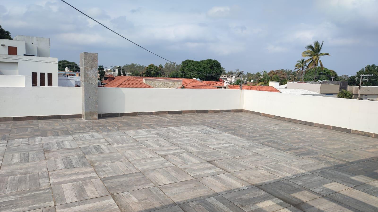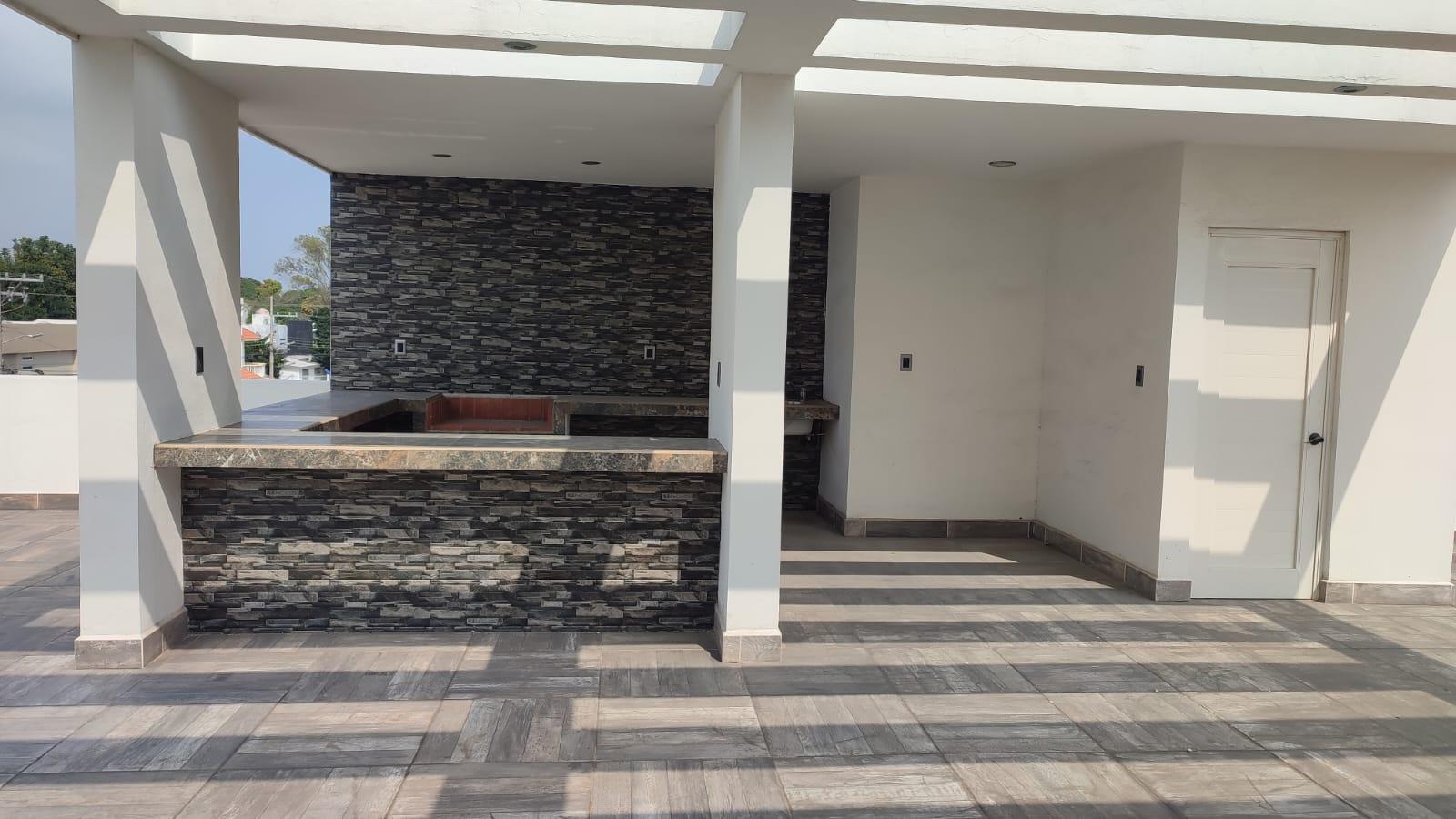 Moderna casa en venta en planta baja cuenta con recamara con baño integrado y closet, sala -comedor -cocina integral con campana ,parrilla y horno portón eléctrico cochera para 4 autos preparación para aires acondicionados, toda la casa con tubería Helvex Hidroneumático Medio baño en planta alta tres recamaras, dos con closets y baños integrados, la recamara principal con vestidor, walk in closet, y baño completo Roofgarden con terraza, asador y medio baño.