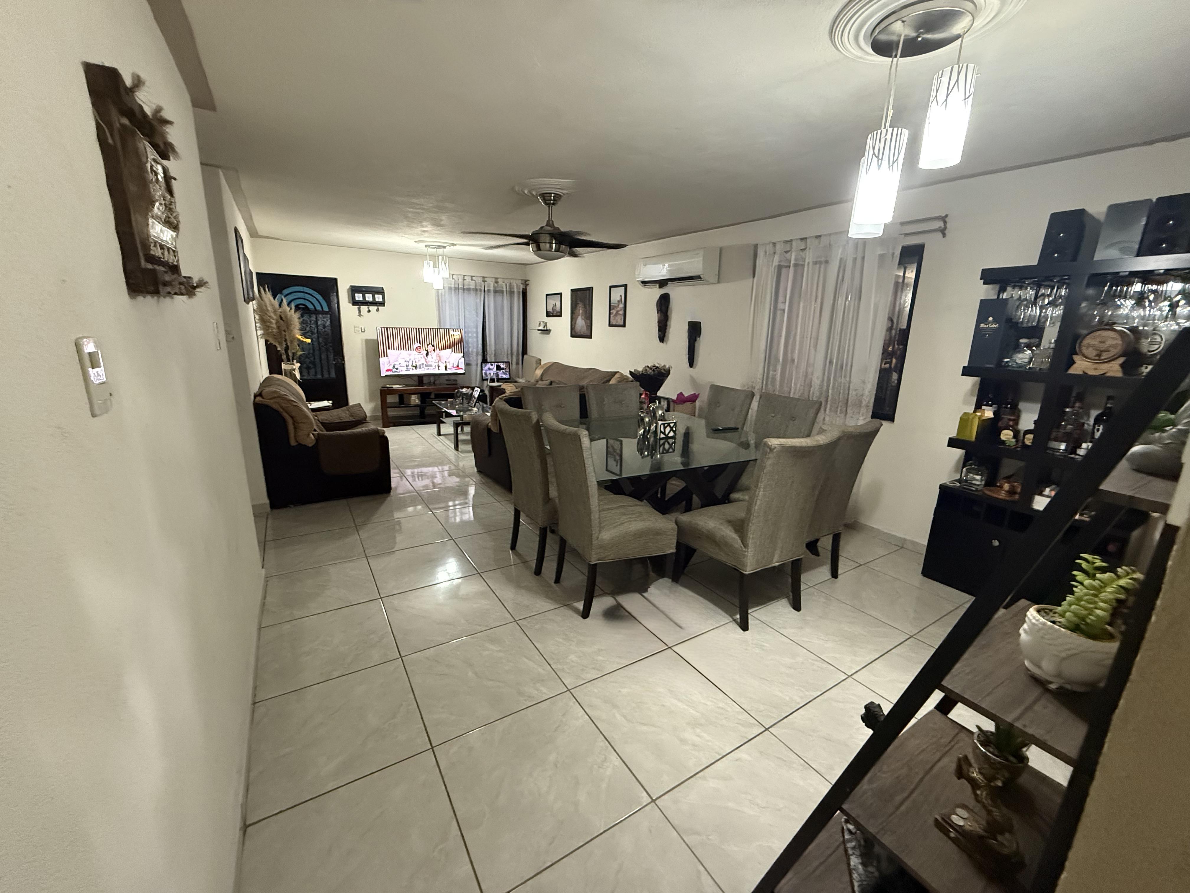 Casa ubicada en zona norte, muy cerca de Ave. las torres, con una distribución muy linda en su interior, amplios espacios en sala, comedor, cocina con amplia alacena empotrada en pared de madera y una pequeña barra desayunadora en su primer nivel cuenta con tres amplias recamaras, todas con closets, en su segundo piso cuenta con una amplia estancia o área de tv y una terraza donde la sección de lavandería y tendido para una mayor comodidad cuenta con escaleras de acceso a la terraza para mayor privacidad cuenta con cochera techada para un automóvil y tiene portón eléctrico, la casa se queda con persianas, lamparas y abanicos de cielo. La casa cuenta con una pequeña bodega en segundo piso para blancos o accesorios de temporada.